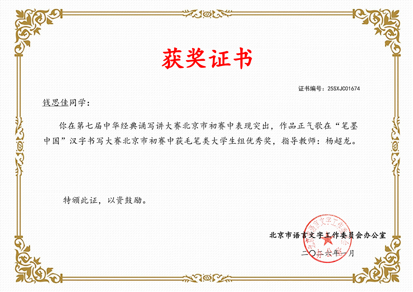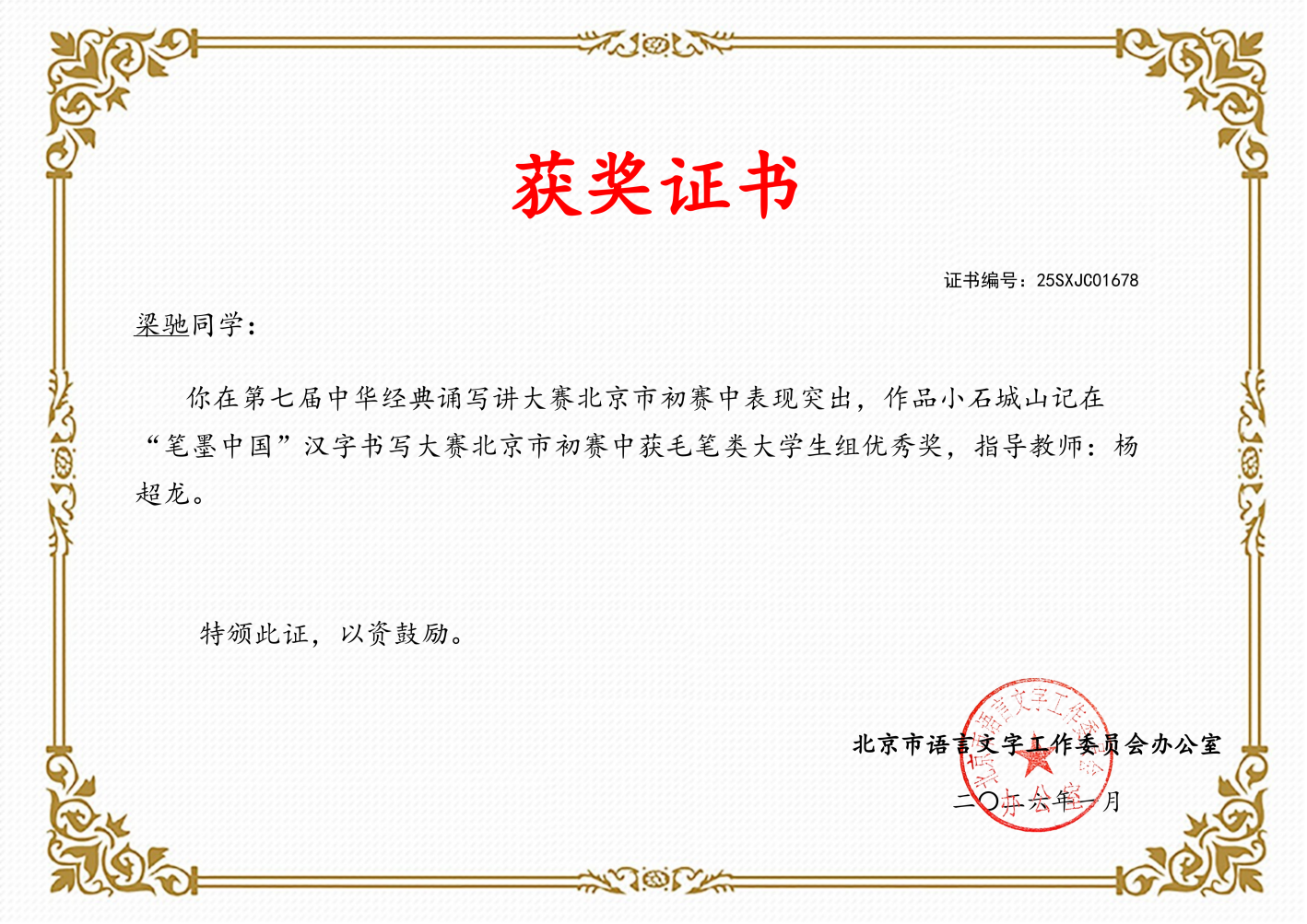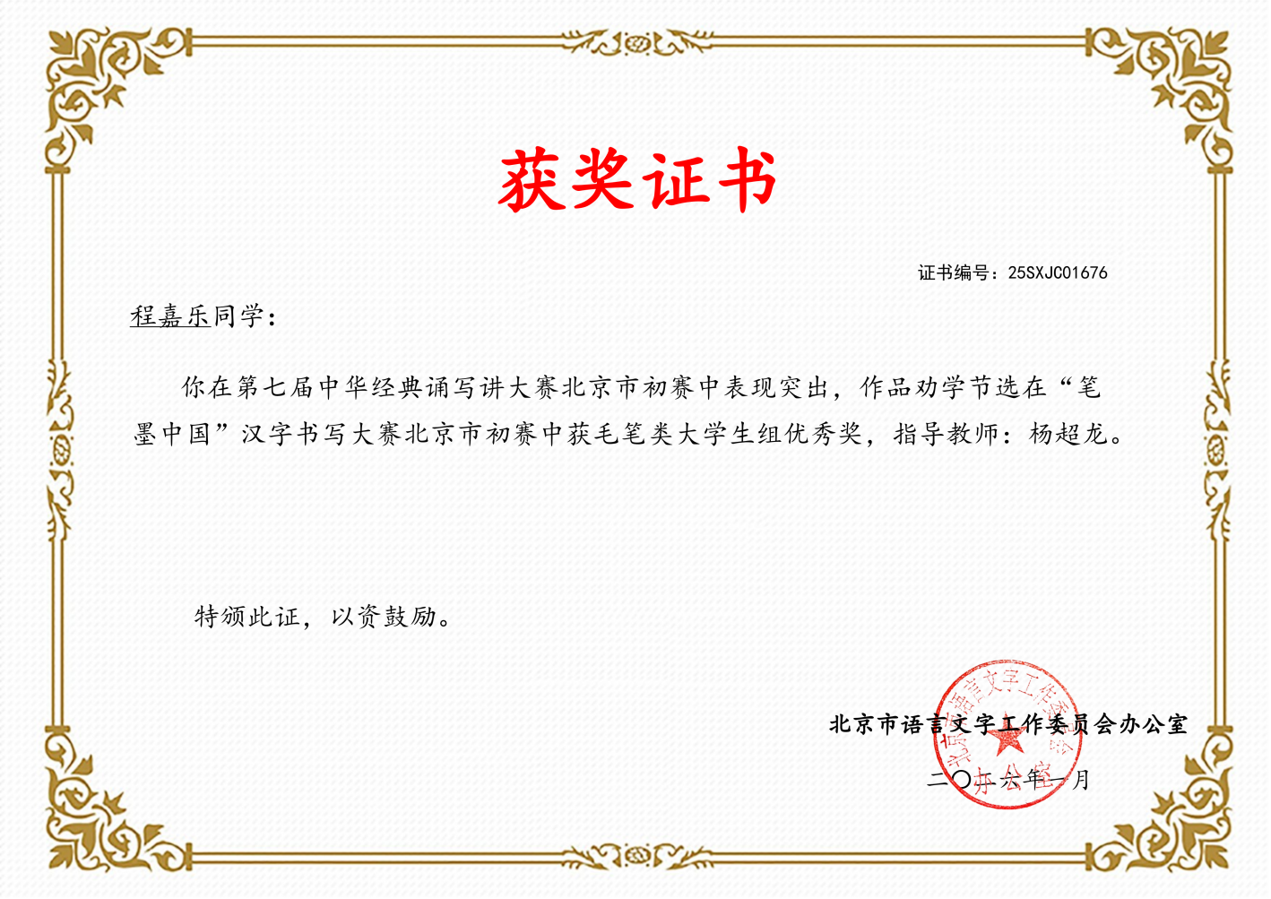 近日,北京市教育委员会、北京市语言文字工作委员会公布2025年北京市中华经典诵读工程系列活动暨第七届中华经典诵写讲活动评选结果。我校杨超龙老师指导绘梦苑社团学生斩获6项省部级荣誉,其中三等奖2项、优秀奖4项;学校连续两年获评“笔墨中国”汉字书写大赛北京市初赛优秀组织单位,实现该项荣誉“两连冠”。