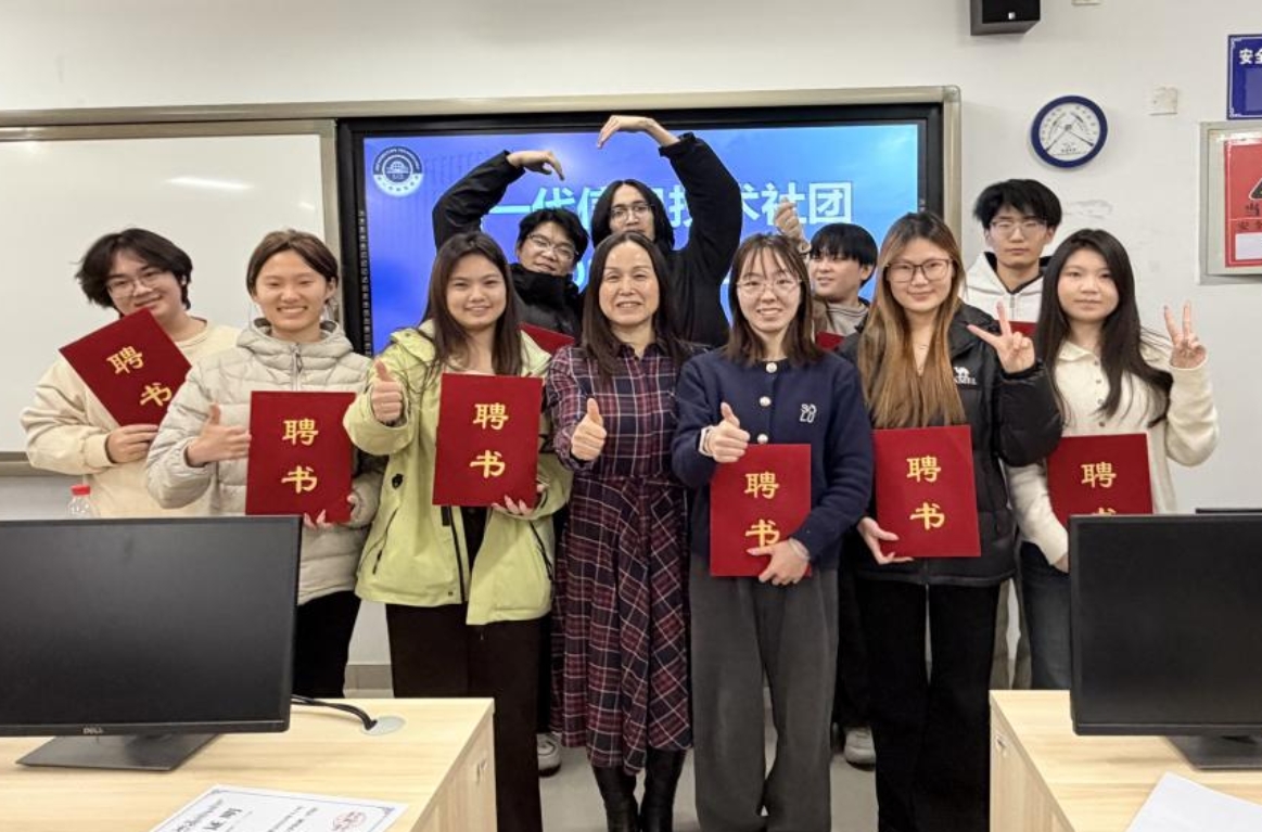 在庄严而热烈的气氛中,张仙妮老师宣读了2025-2026学年新一代信息技术社团骨干成员任命决定及整体聘任决定,并宣布贾梦泽同学担任社团团支书。随后,老师为新当选的社团骨干及团支书颁发了聘书并合影留念。