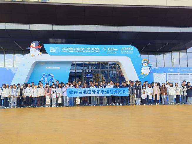 活动当天,尽管天气微凉,却丝毫未减同学们的探索热情。在 “欢迎参观国际冬季运动博览会” 的横幅下,同学们集结完毕,怀着对冰雪科技的好奇,正式开启博览之旅。