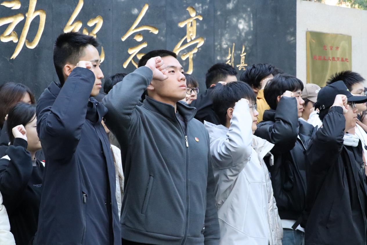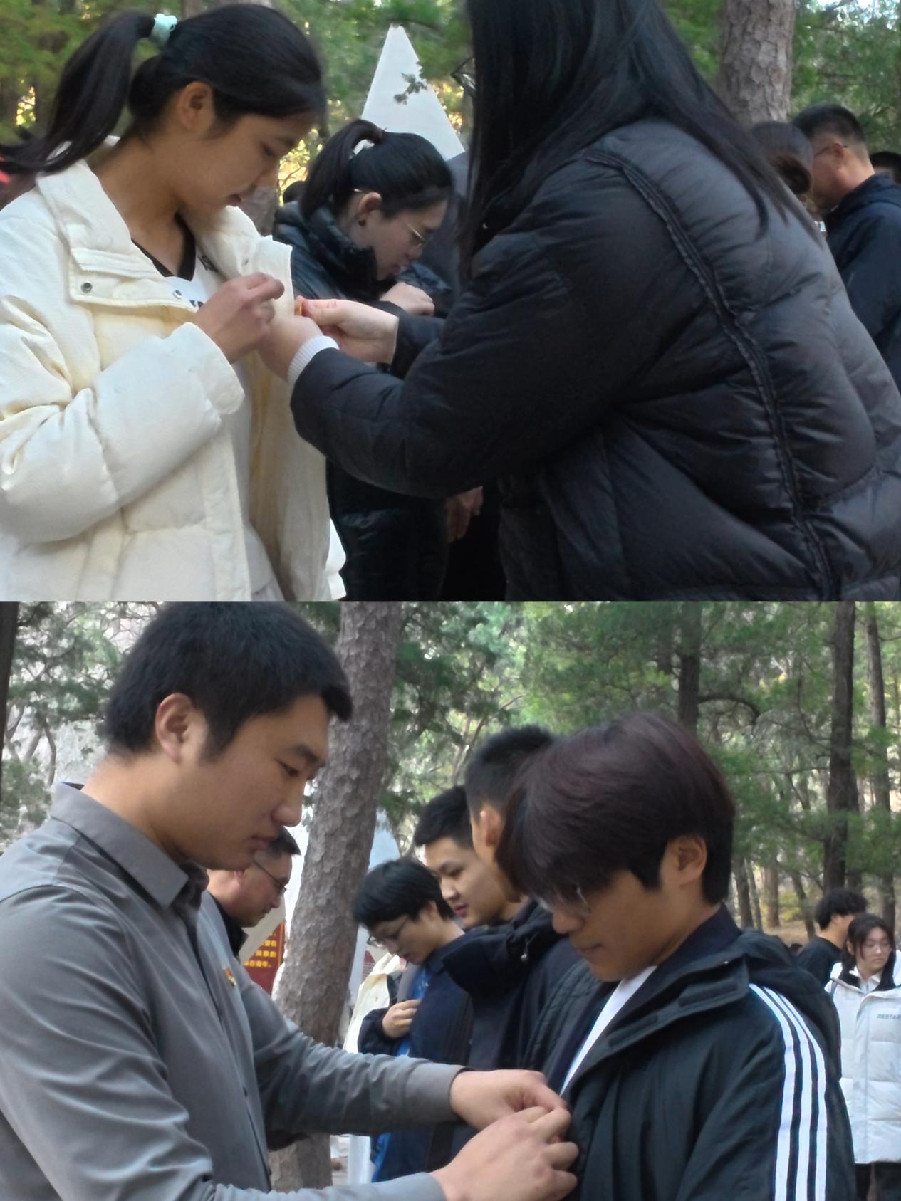 在纪念亭庄严肃穆的氛围中,带队教师为团员代表佩戴团徽,全体团员举起右拳重温入团誓词,铿锵有力的誓言回荡在林间,进一步增强了团员的光荣感与责任感,强化了青年学子对团组织的归属感与身份认同。