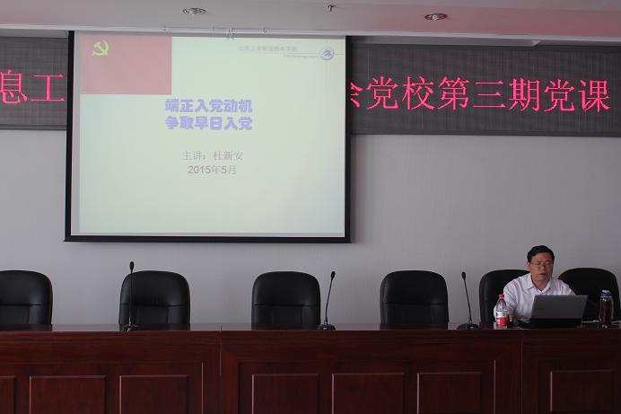2015年5月19日,电气与信息工程学院业余党校第三次党课于12:30在综合楼三层报告厅准时开讲。党课由杜新安老师主讲,出席党课的老师有赵勇和田举鹏。杜新安老师向学员们做了主题为如何端正入党动机的党课。