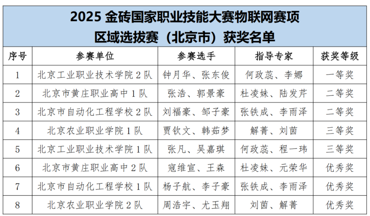 在连续3小时的竞赛中,信息工程学院电子信息与物联网专业的学生们展现出了卓越的专业素养和顽强的拼搏精神。赛场上,他们沉着应对各类技术挑战,从传感器安装到网络配置,再到网关调试,每一个环节都力求精准无误。最终北京工业职业技术学院分别获得了一等奖和三等奖的好成绩,2队凭借着扎实的理论基础与实操技能获得晋级国赛的资格。