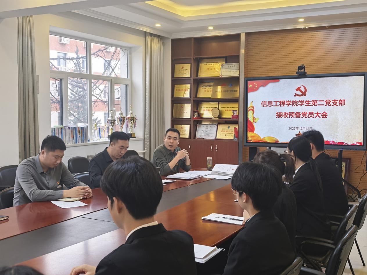 2025年12月12日,信息学生第二党支部于创新楼308会议室召开接收中共预备党员大会。会议由党支部书记韩瑞刚主持,支部全体党员出席。会议核心议题为讨论接收时硕等9名发展对象为中共预备党员。