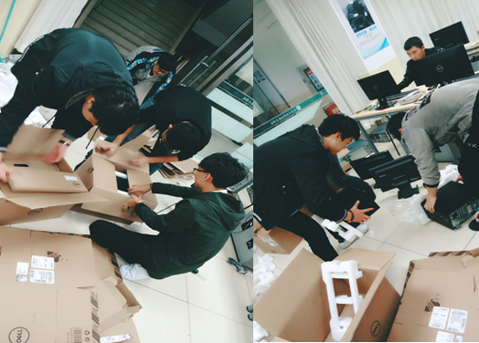 本次活动由王英卓老师带领,通信协会成员组成维护团队,对创新楼1212实训室机房进行大规模换新维护组装。最开始是到机房拆卸必要的主机网卡和还原卡,并且检查各个机房主机用电的安全隐患和电脑的运行是否正常。随后将所需的新电脑主机和显示屏搬运至维护机房内,对机房内原有的主机和显示屏进行拆卸和安全搬运。结束后对新的主机和显示屏进行组装连线并测试。最后在王英卓老师的带领下对各个电脑进行统一配置和程序安装。